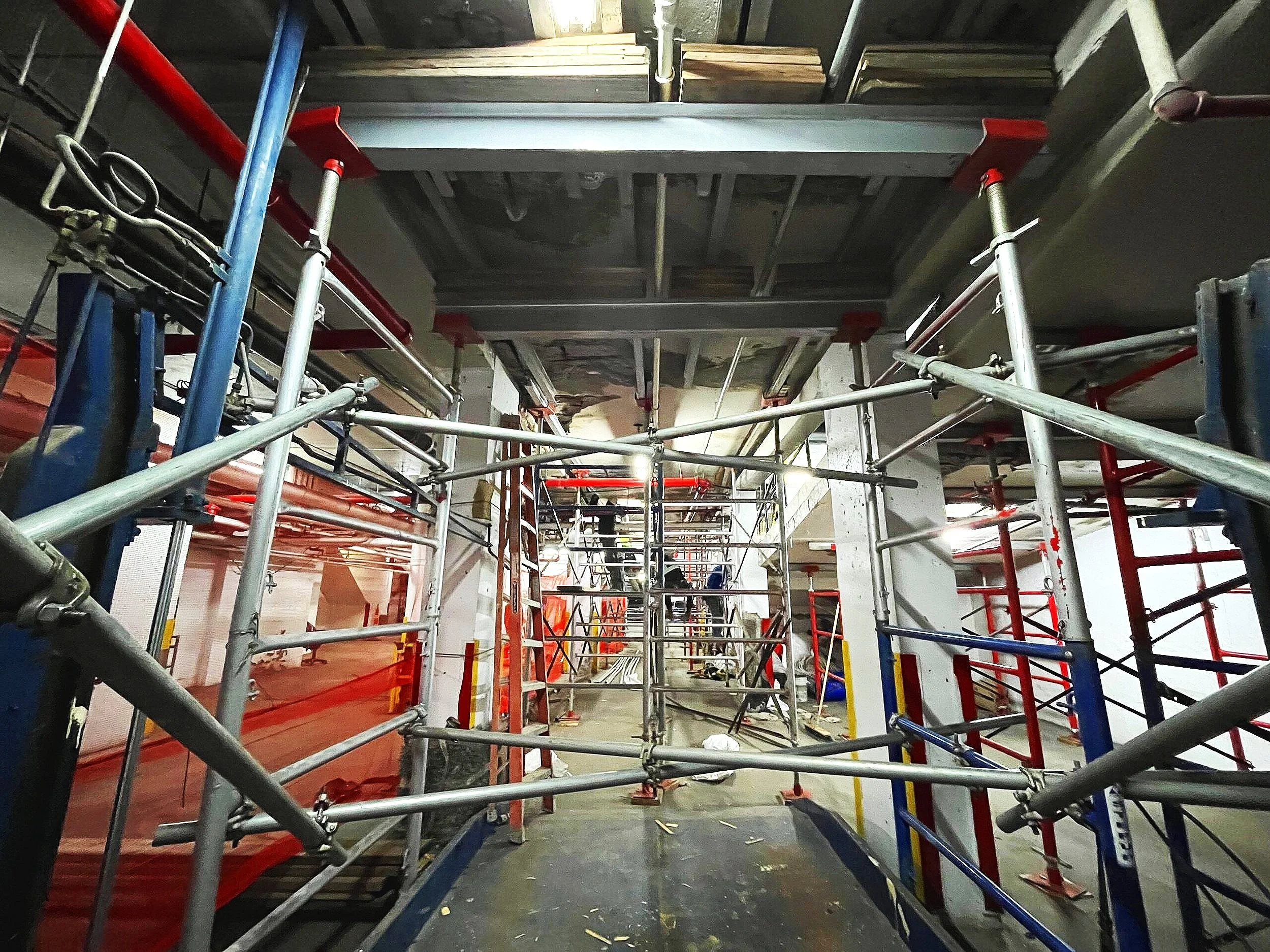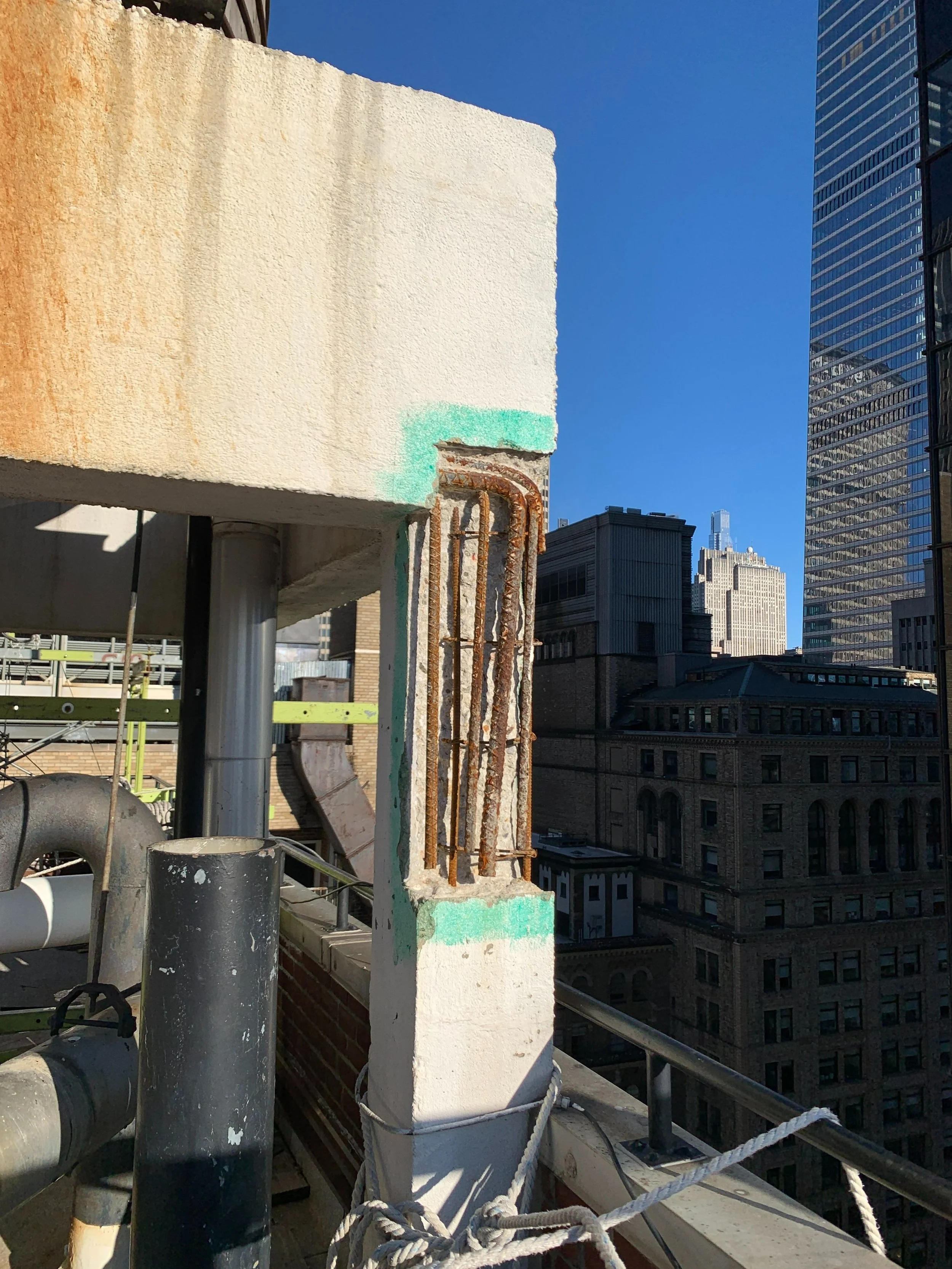 Structural repairs on the roof dunnage, addressing significant issues uncovered during probes. The investigation revealed poorly installed reinforcement in the concrete columns and missing reinforcement in the beams, which led to excessive stress and subsequent micro-cracking. Over time, these cracks allowed water infiltration, causing further concrete cracking and spalling. Additionally, it was found that the existing dunnage was overstressed due to the weight of the current equipment.