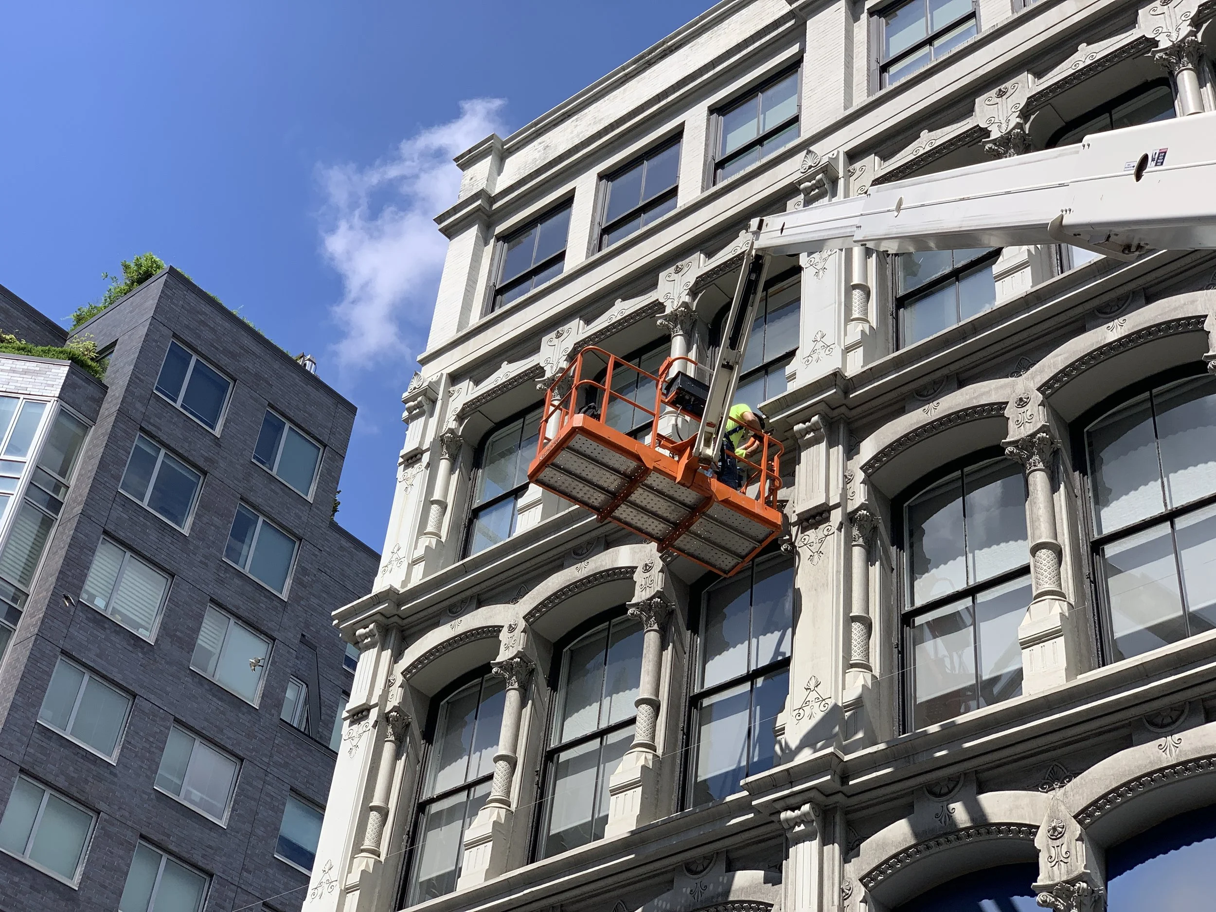 Localized repairs with a boom lift during a façade inspection. This allowed precise access to the building's exterior to address cracks, spalling, and loose materials, ensuring façade integrity and safety. This method minimized disruption to occupants while maintaining high workmanship standards.
